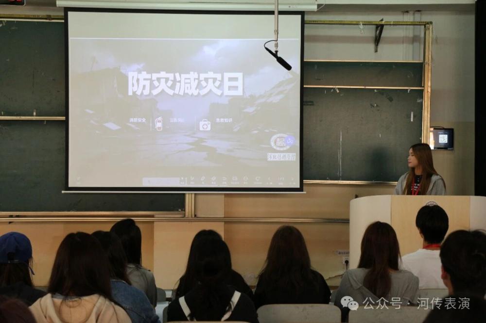 今年5月12日是我国第17个全国防灾减灾日,主题为“人人讲安全、个个会应急——排查身边灾害隐患”。为落实我校2025年教育教学审核评估中立德树人的根本任务,增强同学们的安全意识,提升应急处置能力 ,表演艺术学院在阶梯教室101举办了全国防灾减灾日宣传活动。此次活动由表演艺术学院学生会执行主席马强和学生副书记刘嘉懿共同主持。