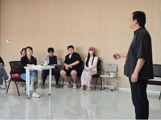 随后,青年教师进行了台词片段展示。常玉红强调,台词不仅是语言的艺术,更是节奏与情感的交织。她重点指导了台词片段的表现技巧,尤其注重语言节奏的转换、停顿与强弱控制,帮助教师们在呈现角色时更精准地把握情绪层次和观演距离。通过现场排练与针对性调整,多位青年教师在台词表达和角色塑造方面获得具体而深入的改进建议。