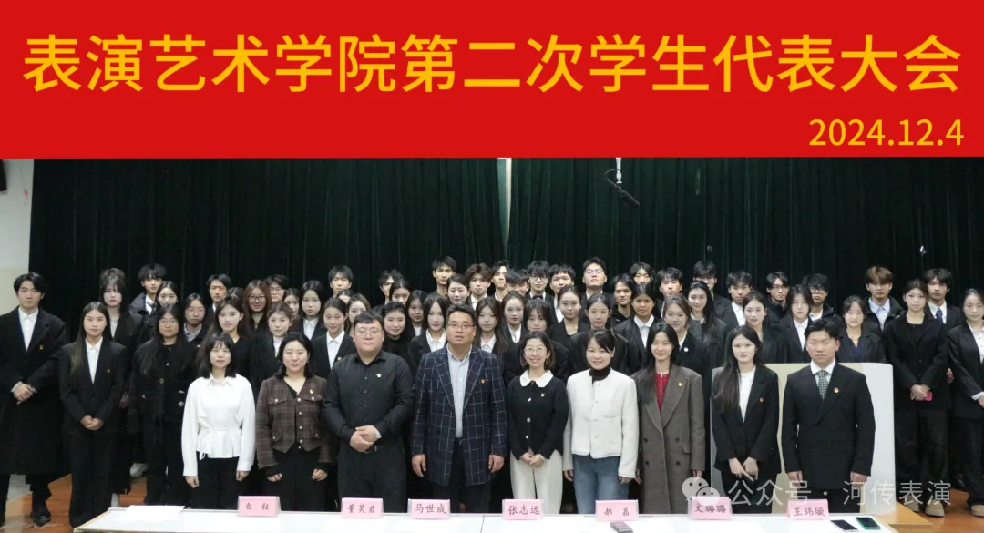 12月4日,表演艺术学院第二次代表大会在阶梯教室101隆重举行。表演艺术学院党总支书记张志远、团委书记马世成、学生党支部书记郝晶以及辅导员老师董笑君、文璐璐、白钰、王玮璇与学生代表56人参加本次大会。