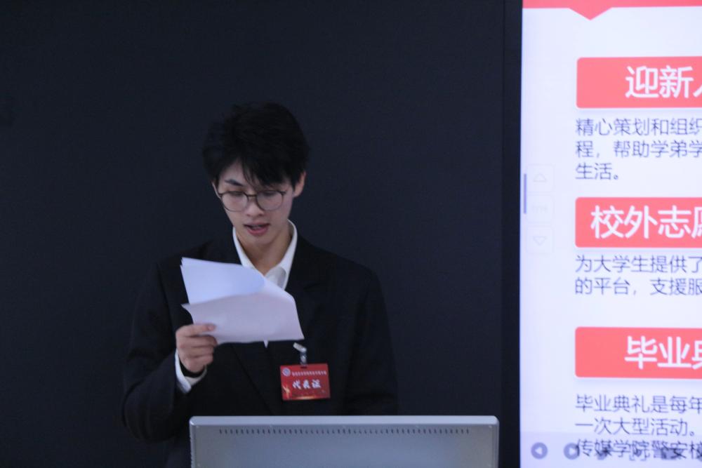 预备会议后,学生代表大会正式会议在雄壮的国歌声中拉开帷幕。表演艺术学院团委书记马世成致开幕词,他强调,学生组织要始终坚守“引领青年,服务青年,凝聚青年”的宗旨,团结带领广大同学坚定理想信念、锤炼过硬本领,共同助力学院立德树人工作走深走实。会上,学生会主席马强代表第二届学生委员会作工作报告,系统回顾过去一年工作成效,清晰展望未来发展方向,全体代表认真审议并表决通过该报告。