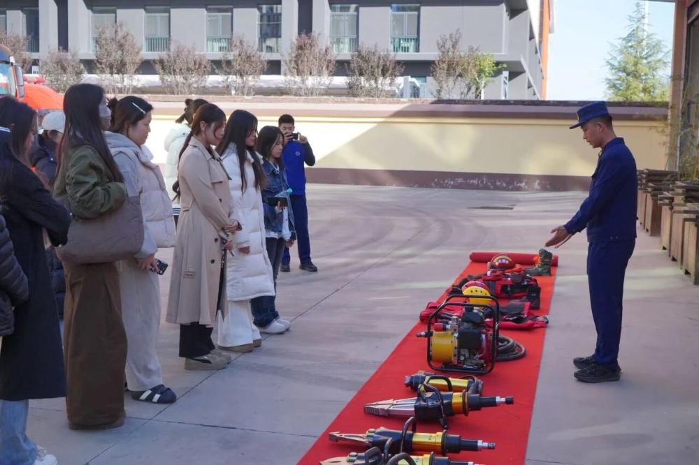 活动中,消防员首先带领师生参观了消防车辆与各类装备器材,通过实物讲解与现场演示,详细介绍了水罐消防车、抢险救援车的功能用途,以及空气呼吸器、破拆工具等装备的操作原理,近距离感受消防“硬核实力”。